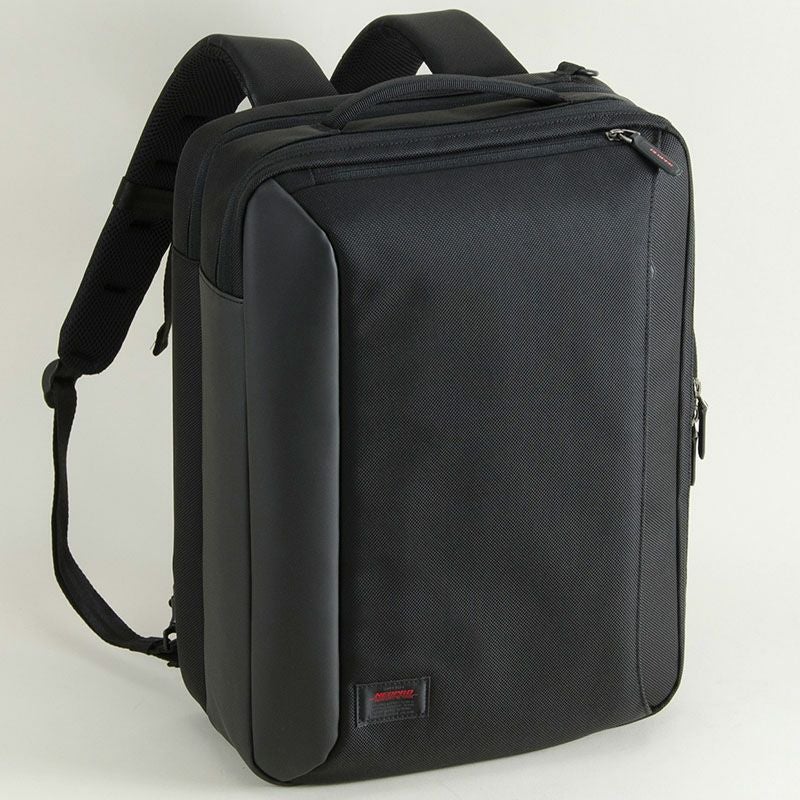 斜めに折り込んだ本体一体型のトンネルに収まるファスナー引き手が特徴的なデザイン。 ネオプロ・レッドポイントのリュック 3way