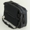 前にプックリ張り出した前ポケット。上部には小物ポケット。メインルームはメッシュポケットや、ファスナーポケット付き。後方にはクッション材入りのPCルーム。背面のテープでキャリーに通してセット可能。横向きにしてブリーフ、ショルダーとして使用も可能。