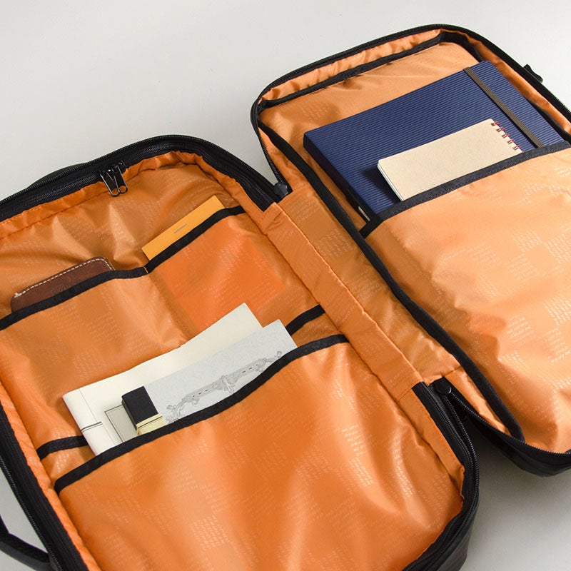 背面ルーム:オープンポケット(大)、PCポケット(クッション材入り) 前面上:オープンポケット(大)、ファスナーポケット(中)、ペン挿しx2、