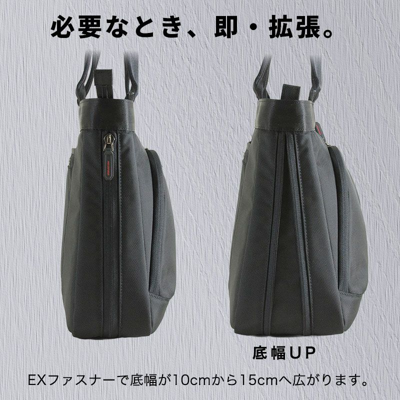 EX(エクスパンダブル)ファスナーで底幅が広がり収納力がアップする3型が、