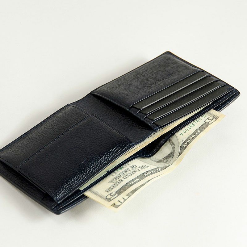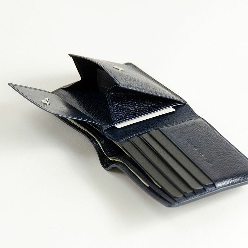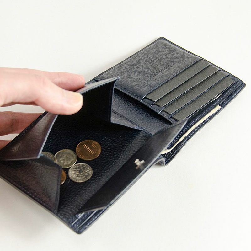 商品説明4枚のカード収納ポケットと、その下にもカードなどの入るサイズのフリーポケット付き。大きく開くマチ付きの小銭入れとその下にもカードなどが入るフリーポケット付き。2層の札入れスペースも付いたミニマム設計ながら十分な収納力がある二つ折り財布。