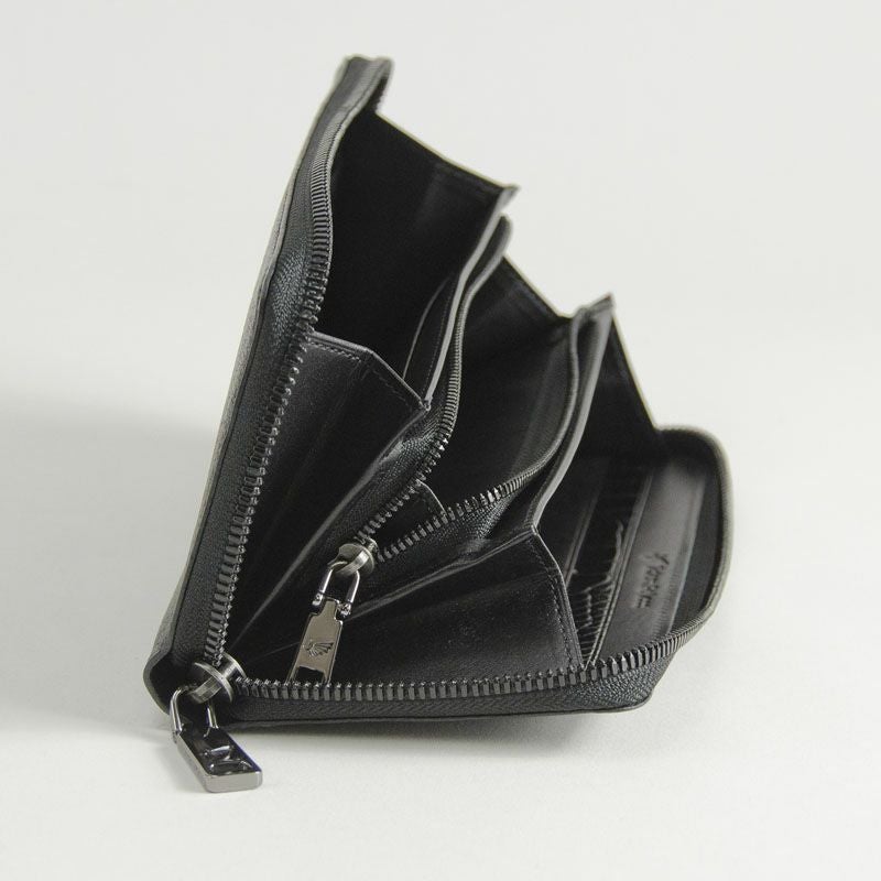 小銭入れのファスナーはL字型に開閉し、マチ幅が付いている事で取り出しやすい設計です。小銭入れの両サイドにはカード入れがそれぞれ1枚づつ付属。