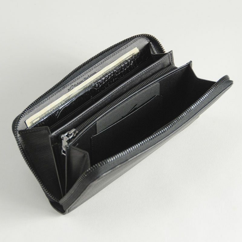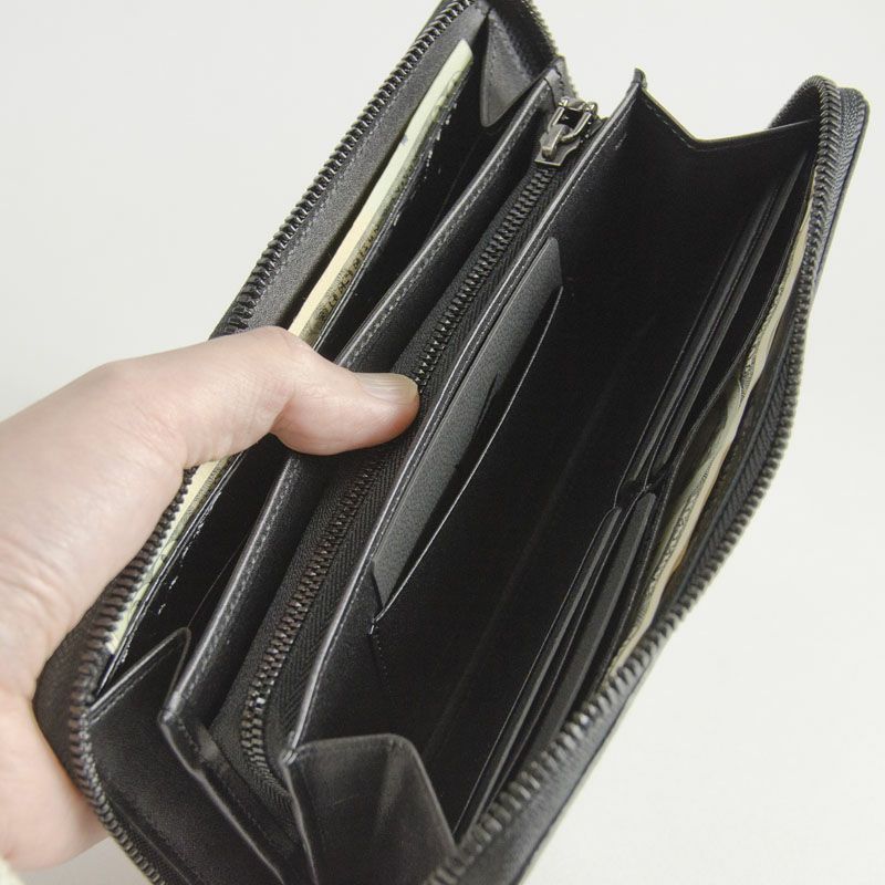 商品説明小銭入れ、カード収納10枚、お札やレシート入れとたくさんの収納力をもったラウンドファスナータイプの長財布。
