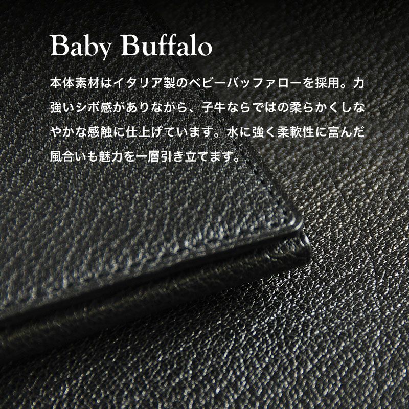 シリーズ説明イタリア製のベビーバッファロー(子水牛)を本体革に用い、重厚な質感のある財布。