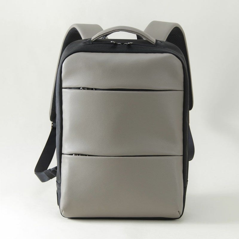 商品説明さわやかスポーティスッキリとした細マチのスマートリュック。 隠しファスナーでスッキリ!! 軽快でリッチな柔らかなレザー風 ソファーにも使用される高品質なソフトレザー(PU)を贅沢にもフェイスにたっぷり使用し、スッキリとしながらも主役的存在感は抜群。ファスナーを隠し形状にする事により、ファスナーレスな意匠がデザインの特徴となる軽快でスポーティなアイテム。 ■本体内部には、クッション材を使用したPCポケット、小さな手帳などが入る小分けポケット付き。 ■本体背面に、側部から財布や携帯を収納できるファスナーポケット付き。 ■リュックベルト付根に角度をつけて、背負った際に自然と肩幅に開く設計。 ■トップハンドルとは別に設けたフックにより、机やトイレのドアなど吊るす際に便利。 ■本体内部には、クッション材を使用したPCポケット、小さな手帳などが入る小分けポケット付き。 ■本体は側面まで大きく開くが、荷物がこぼれ出ないマチ付き。 ■背面ポケット上部は、キャリーハンドルに通せるループとなるファスナー付き。 ■底面には床との直接の設置を軽減する底足付き。