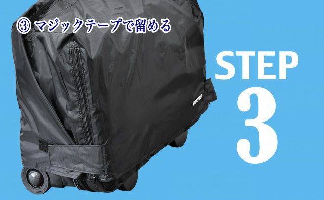 ネオプロのAmePRO レインカバー(横型)は、簡単3ステップで着用可能!① カバーをかぶせる ネオプロのAmePRO レインカバー(横型)は、② ファスナーを下ろす ネオプロのAmePRO レインカバー(横型)は、③ マジックテープで留める