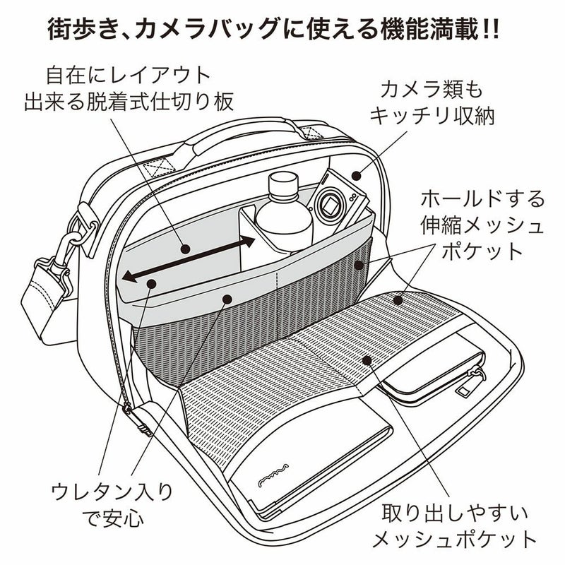 内装 メインルーム:脱着式仕切り板(ウレタン入り)、オープンポケット中(伸縮メッシュ)x2、オープンポケット中(メッシュ)x2