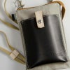 前面にプックリとしたフロントポケットと背面にはICカード等を隠し入れられる。 プックリ盛り上がったフロントポケットはマグネットホック付きで取り 出しやすい。背面のヌメ革で作られたカード入れは、Suica などの IC カード等を入れておくと、簡単に取り出しもできて使い勝手は抜群。
